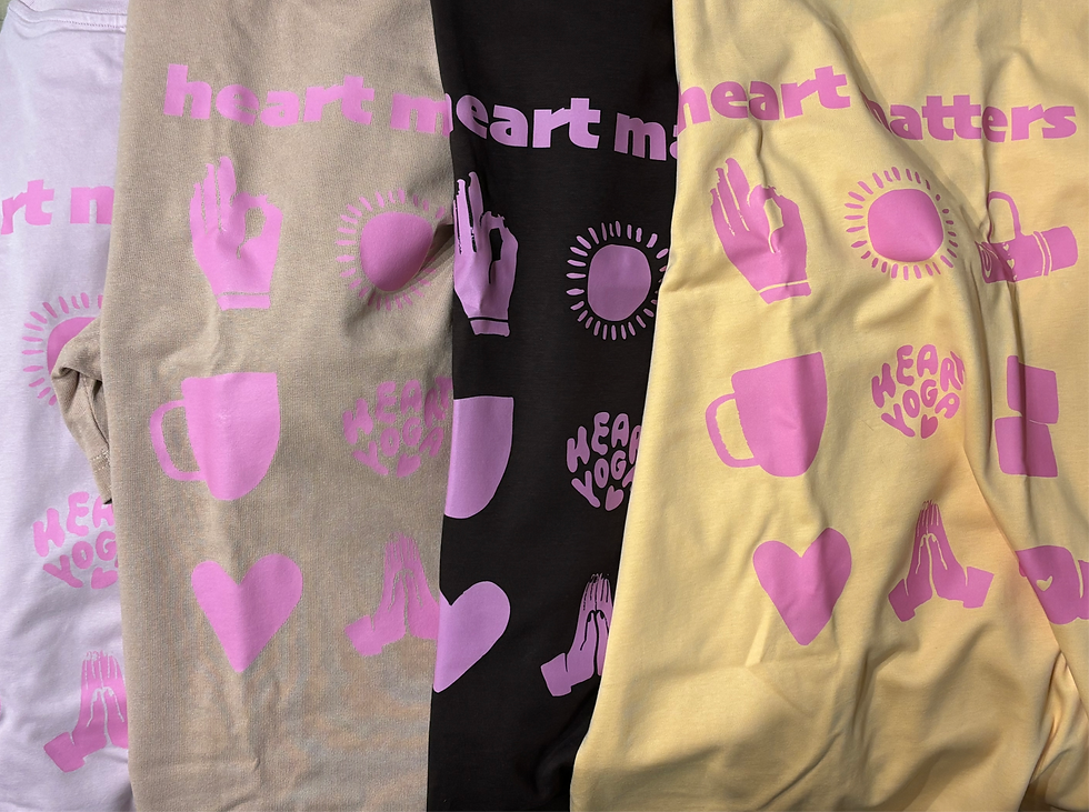 Heart matters on your tee, a perfect mantra for the day: grab a slow-drip coffee, flow through some juicy mat magic, then honour the ritual with a pistachio croissant—soft respect, quiet gratitude, namaste to the whole wild world