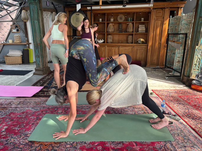 As the practice unfolded, we shifted into a partner flow — heart to heart — exploring shapes of support, balance, and shared movement. There was playfulness, laughter, and moments of quiet trust as we leaned into one another — both literally and energetically. The forest seemed to hold us, amplifying that feeling of being part of something larger than ourselves.